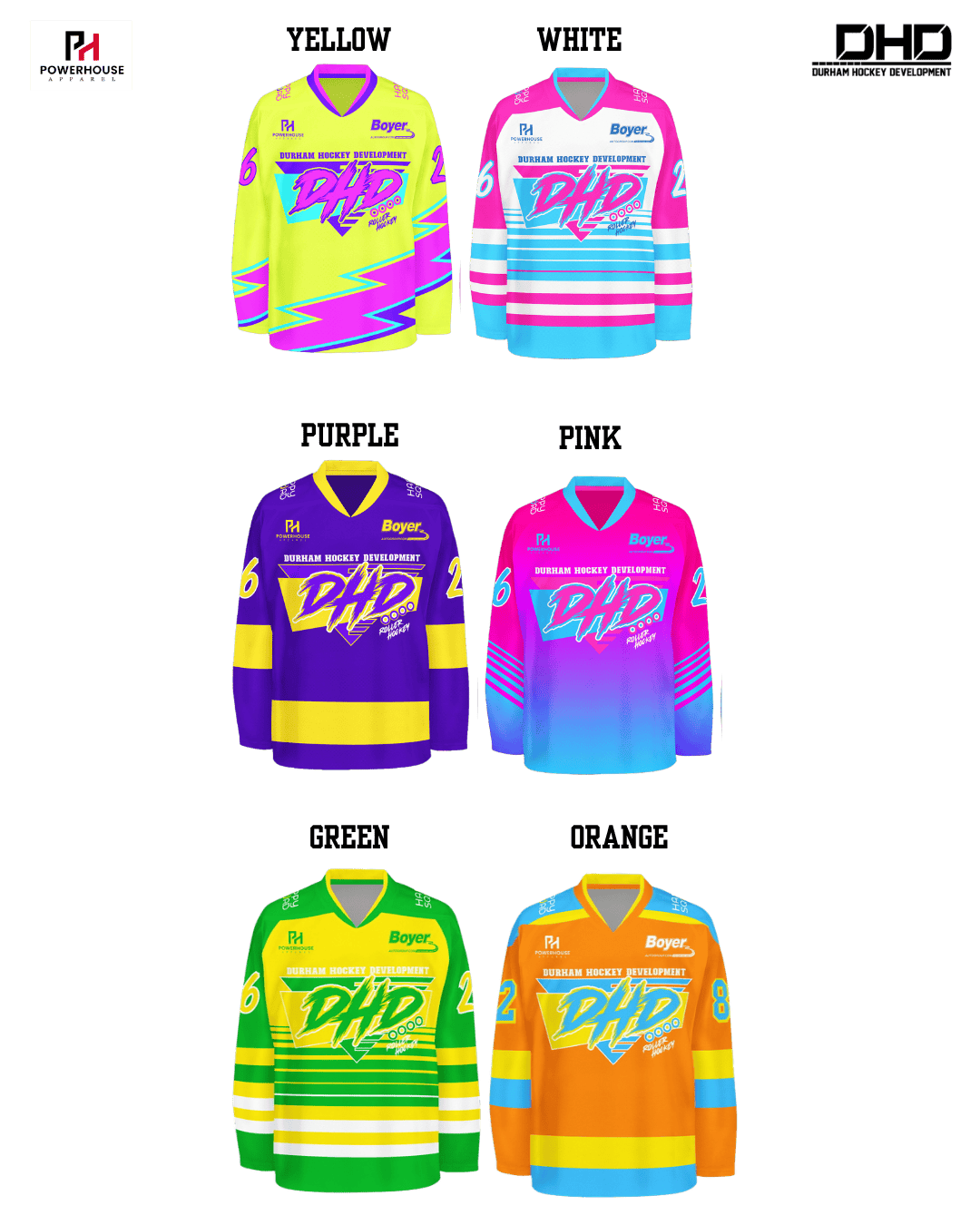 Carolina Blue, Green, Orange, Purple, White, Yellow